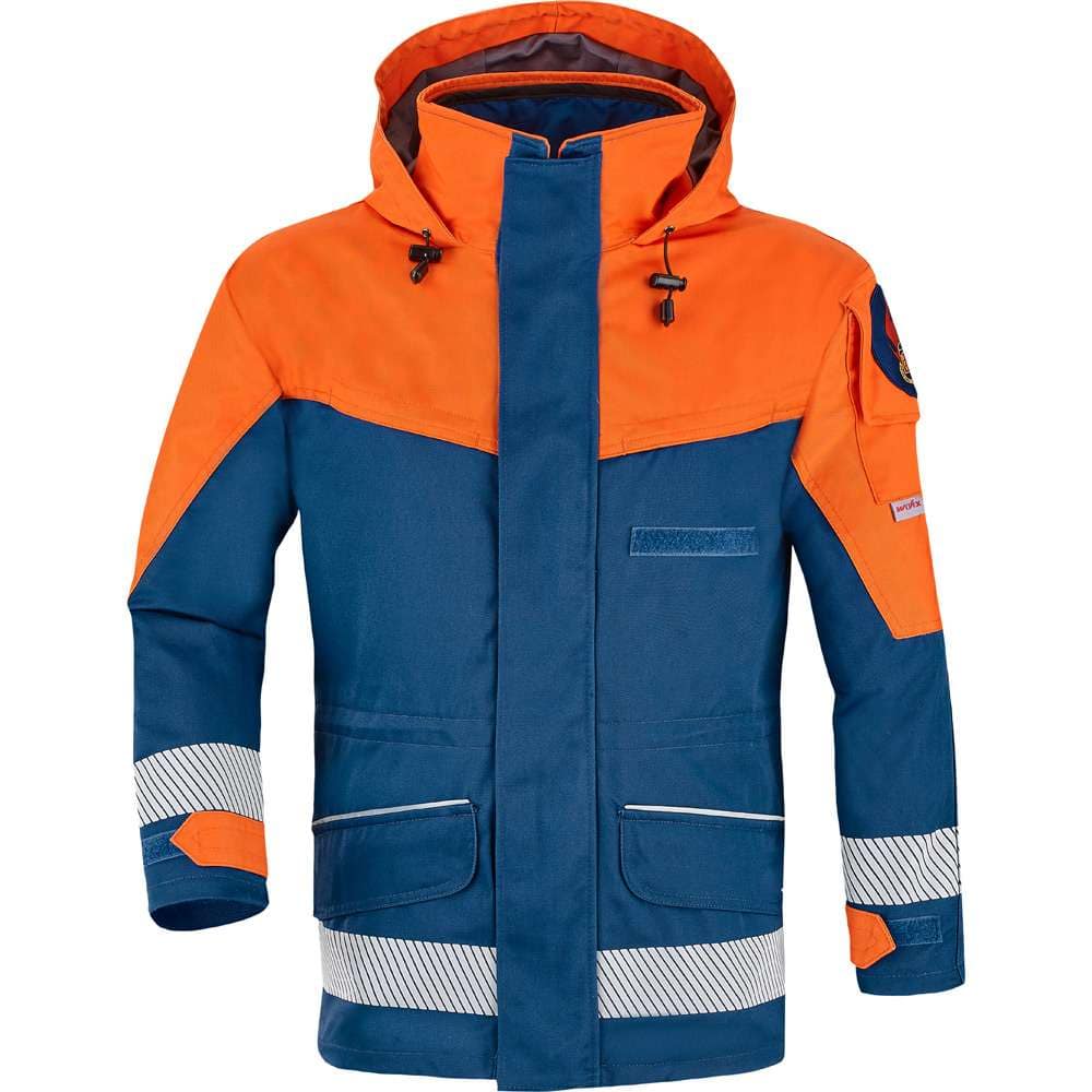 Jugendfeuerwehrparka mit herausnehmbarer Fleecefutterweste, segmentierte Reflexstreifen an Ärmeln und Saum für optimale Sichtbarkeit.