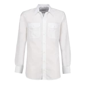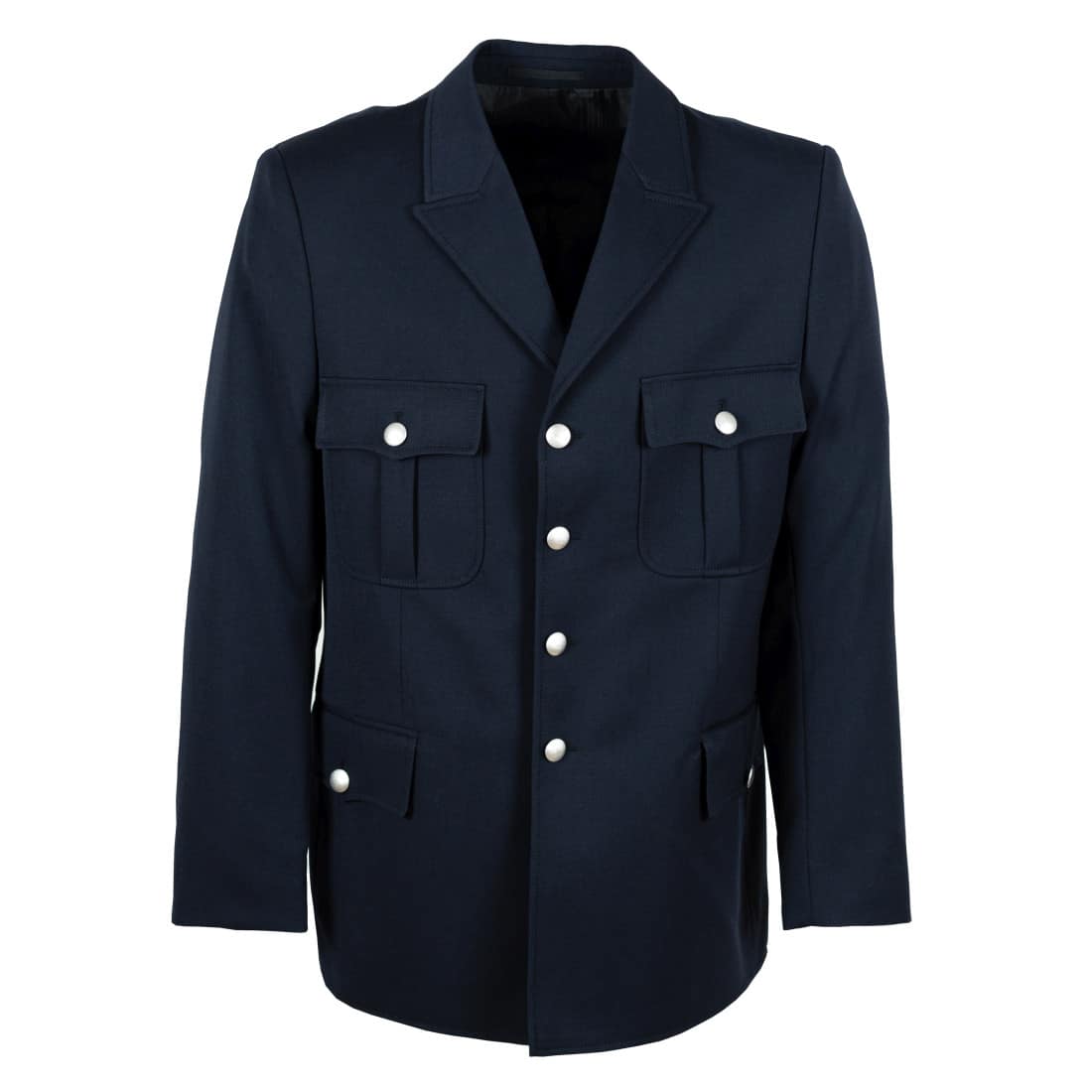 Dienstrock, Kammgarn-Trikot, Oberstoff: 45 % Schurwolle-Trikotine/55 % Polyester, Innenfutter: Taftfutter schwarz, Farbe: dunkelblau, einreihig, mit 4 Knöpfen, mit zwei aufgesetzten Brusttaschen und zwei eingeschnittenen Seitentaschen mit je einer Patte und Knopf, leicht tailliert mit Rückenschlitz, aus dunkelblauem Tuch auf Einlage gearbeitet und frontfixiert. Fabr. Der Klassiker.